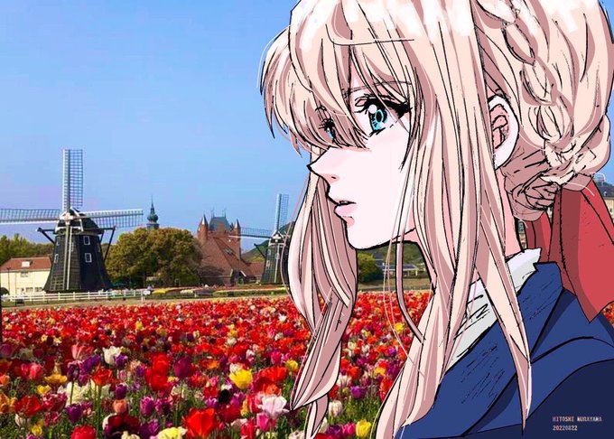 #みなさん1年前の今頃はどんな絵描いてましたか 検索したら、#ヴァイオレット・エヴァーガーデン のファンアートが2枚出てきました^ ^ どちらも鉛筆書き→スマホで撮影→PC取り込み→Windowsのペイントでマウス彩色、の手順です。 背景は #ハウステンボス で撮影したもの。