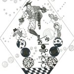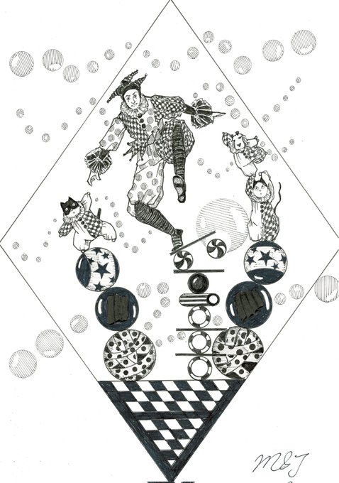 🎈Title ✿おっとっと!グラグラ揺れるね!💦💦💦😱✿ (《道化師と陽気な仲間たち》による楽しいアクロバットショー 🎪🃏😸😺🐶) #道化師と陽気な仲間たち #アトリエの系譜S #マンガスタイルイラスト #アナログ #モノクローム #アクロバット #バランス #ペン画 #オリジナルキャラクター