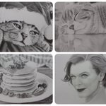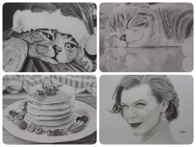 #今月描いた絵を晒そう 今月は4枚描いてました😺🥞👩😺✨ 寒いですね😖⛄❄✨ 風邪などひかれませんように😷 #鉛筆画 #シャーペン画 #模写 #似顔絵 #猫 #パンケーキ #ミラ・ジョヴォヴィッチ #みんなで楽しむTwitter展覧会