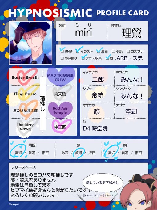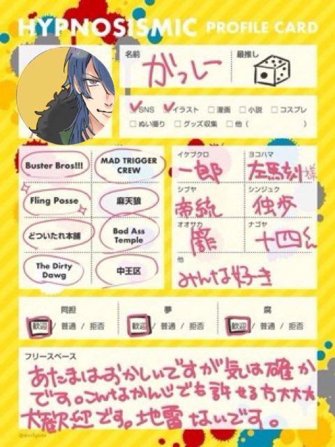 #ヒプマイ好きさんと繋がりたい #ヒプマイ絵描きさんと繋がりたい そっとタグ失礼しますー!絵とか描いてます! 自己紹介カード、使い回し&画質最悪ですみません😭 ゆっくり、いいねとRT巡回します!よろしくお願いします!