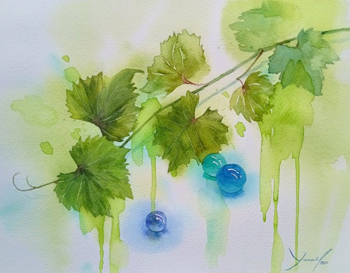 「山葡萄とビー玉」 お盆前の一枚🖌だけど、もう季節はずれの感じがしますね #透明水彩 #水彩画 #水彩 #絵 #山葡萄 #ビー玉 #晩夏 #watercolor #watercolorart #aquarelle