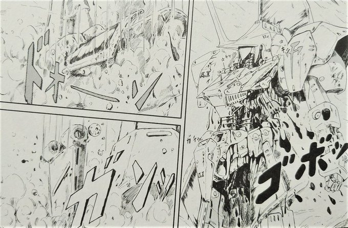第一巻の終盤。 土煙の中から現れたのは、高々と屹立する二つ折りのバスターランチャー、激しくうねるスタビライザー、響き渡るイレーザーエンジンの音、光り輝く黄金の巨体。 ファイブスター物語ファンなら #このシーン嫌いな人いない説 #ファイブスター物語 #FSS_jp