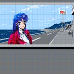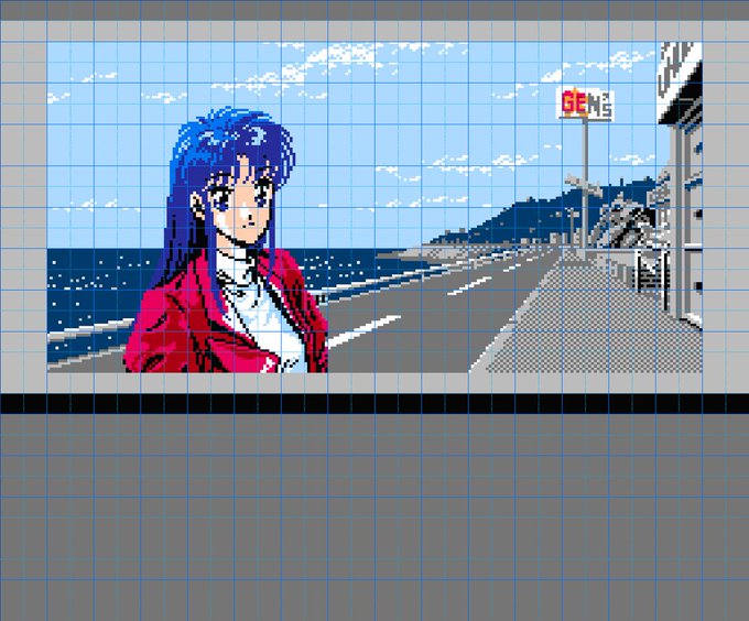 その #ファミコン スプライト数の上限が良くわかるのが、海岸線のエリナの #ドット絵 です。 このグラフィックはエリナの描画のほぼ全てがスプライトで構成されている為、設計で色付けを行なおうとしていた看板にスプライトが一枚足りませんでした。色が半分です(汗) #メタルスレイダーグローリー