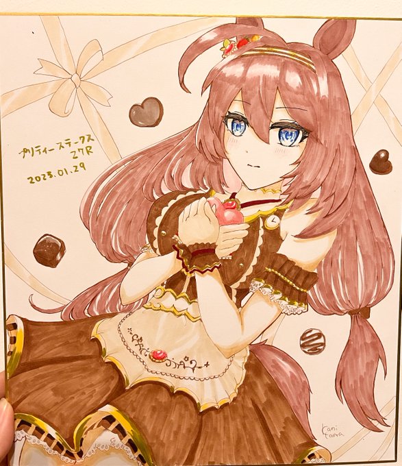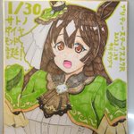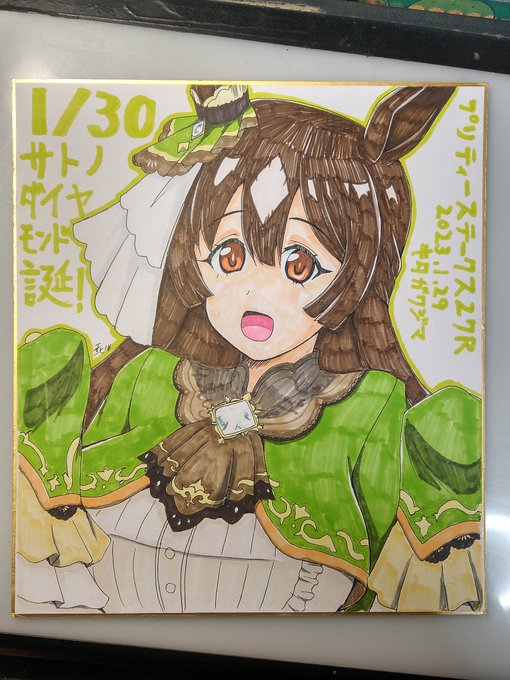 サトノダイヤモンド誕生日おめでとう!🎂 髪の色が合ってるペンが見つからずで微妙な色合いになってしまって申し訳ない… ( #プリステ27R の色紙抽選会にて出品した色紙絵になります。誰の手に渡ったのやら…) #サトノダイヤモンド生誕祭 #サトノダイヤモンド生誕祭2023