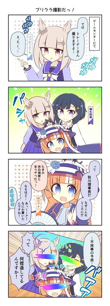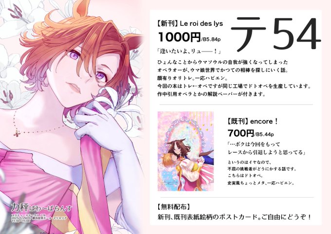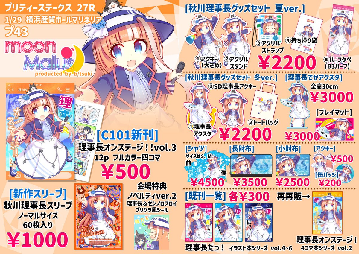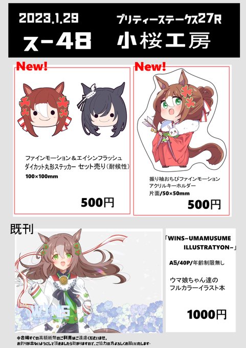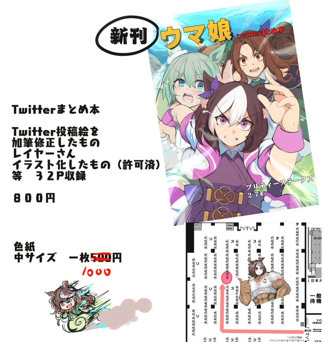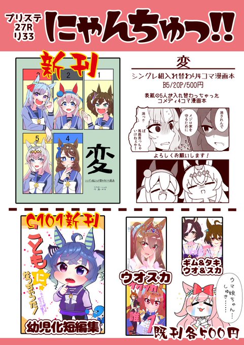 今週末のプリステお品書きです🙌 C101新作のフルカラー4コマと、秋川理事長カードスリーブのほか、 会場特典のノベルティを新しくしました!(C101と違う絵柄です) あと4コマ本の既刊を再販しました! お品書き右半分は既作です!(机には置きません) #プリステ27R #プリティーステークス27R