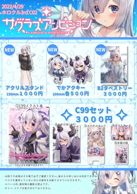 【サクラズアンビション お品書き】 4月30日開催のホロクル5thにて頒布するもののお品書きです! 当日は神咲るうさん(@ruu1170)にコス売り子していただきます💫 ぜひぜひよろしくお願いします🙏✨ #ホロクル #ホロクル5th twitter.com/i/web/status/1…