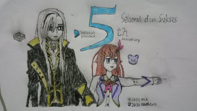 Selamat hari jadi ke-5 untuk hololive Production! Dari Tokino Sora (7/9/2017) sampai Noir Vesper (24/7/2022), holopro sudah jadi teman kita semua. Semoga sukses terus, ya... #ホロライブプロ5周年 🐻💿 #soraArt #ときのそら5周年記念 📗 #VespART
