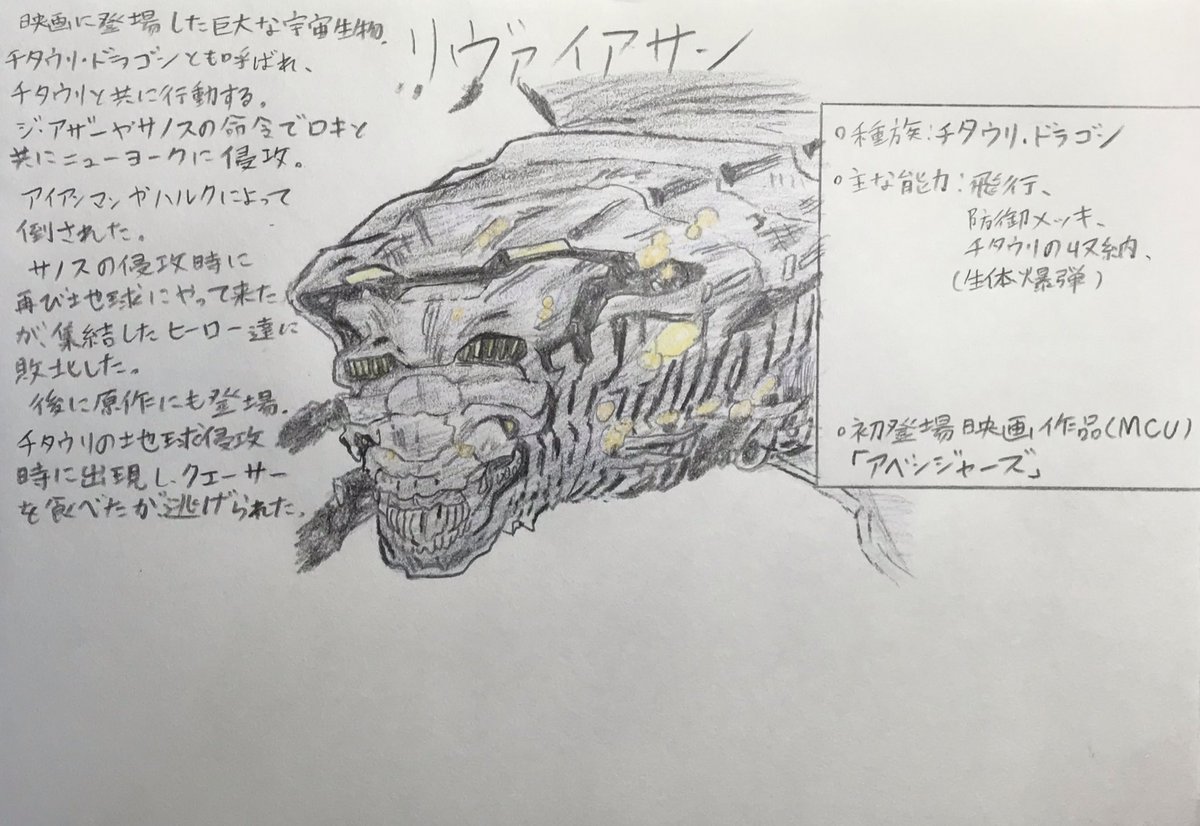 手描きMCUヒーロー列伝 リヴァイアサン ・種族:チタウリ・ドラゴン ・能力:飛行、防御メッキ、チタウリの収納、生体爆弾 ・初登場映画作品(MCU) 『アベンジャーズ』 #marvel #illust #ホークアイ #Hawkeye #芸術同盟 #絵描きさんと繋がりたい #絵描きの輪 #みんなで楽しむTwitter展覧会