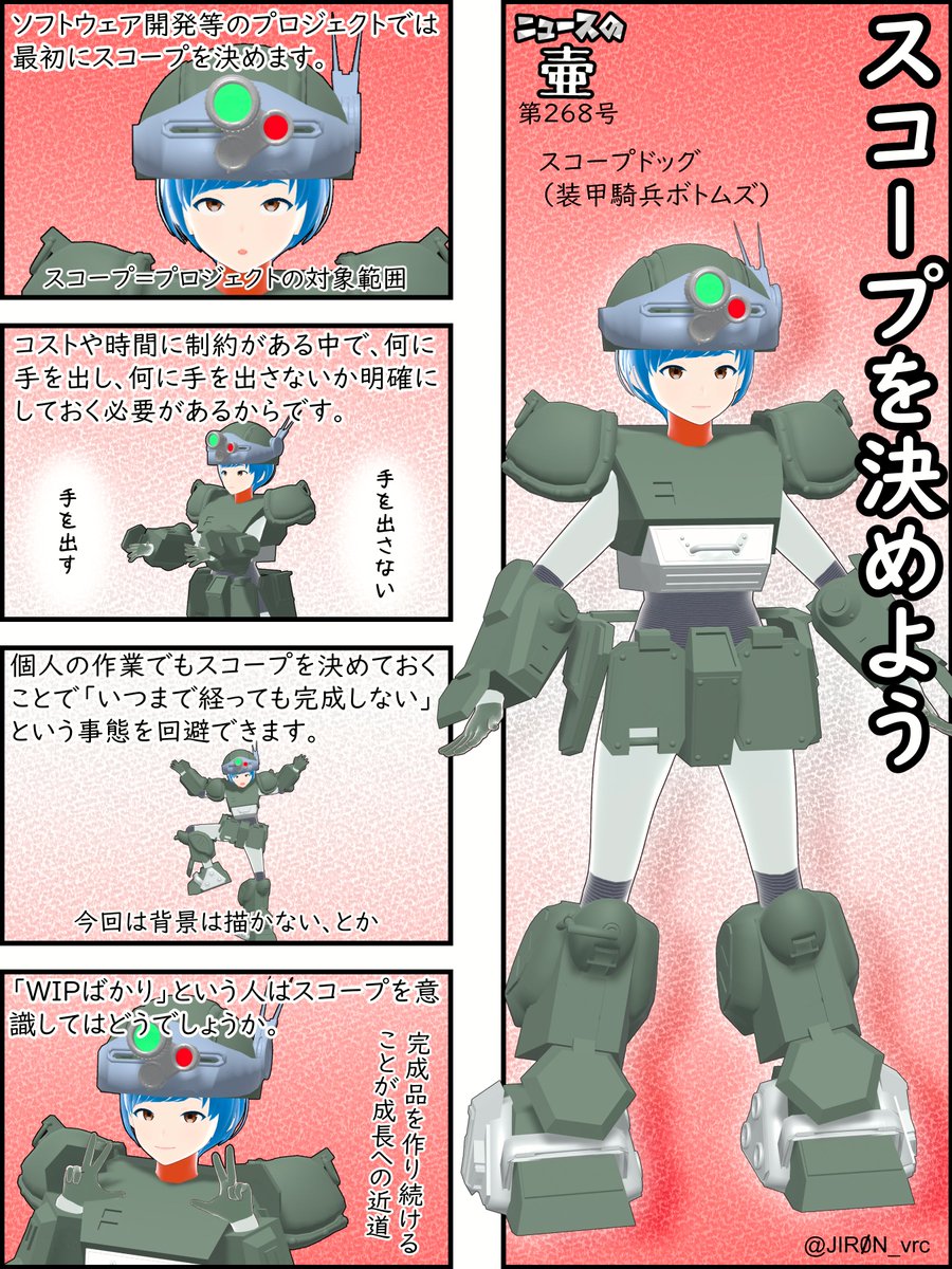 #ニュースの壷 「スコープを決めよう」 ・スコープは狭ければいいというものではなく、前回よりも少し広くすると、その分だけ芸風が広がります ・作品ごとに「技術的テーマ」を決めるとやれることが増えます 「WIP」=Work in Progress =仕掛品、未完成作品 #漫画が読めるハッシュタグ #ボトムズ