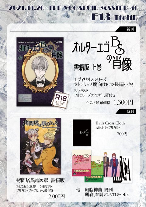 【告知】 2021年11月20日 THE VOC@LOID M@STER 46 悪ノシリーズの二次創作しているサークルです。是非よろしくお願いします。 ■[F13]TtoitR ■お品書き→[pixiv.net/artworks/94153…] ■新刊サンプル→[pixiv.net/artworks/93816…] #ボーマス #ボーマス46 #拷問塔異端の章 #オルターエゴBSの肖像