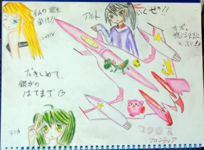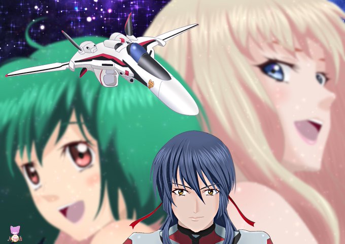 #中村悠一 さん生誕祭(2/20) 「#マクロスフロンティア」より、#早乙女アルト きゅん。 「お前達が俺の翼だ!」 過去絵を修正した絵です。 元の絵はアルトの顔が下手過ぎて線画から描き直し。 アルトの顔描くの苦手😇 #VF25Fメサイアバルキリー #ランカ・リー #シェリル・ノーム