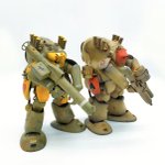 これにて1/20&1/35ファイアボールSG、完成となります。サイズ差を活かしてこういう風に飾ってやると「奥にもう一機いる」的な、箱絵にありそうな遠近感になるかと思ったのですが...ちょっと無理ありますねw #マシーネンクリーガー