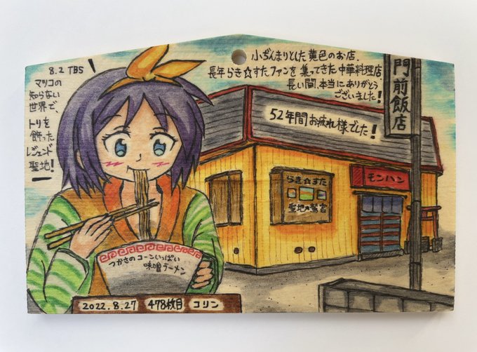 鷲宮神社に絵馬奉納しました。中華料理店.門前飯店さんが8月一杯で52年間に及ぶ営業を終了するので、お店と合わせてラーメン食べる柊つかさを描きました。 らき☆すたファン集いの店としてもお世話になりました。本当にありがとうございました!(・∀・) #らきすた #マツコの知らない世界