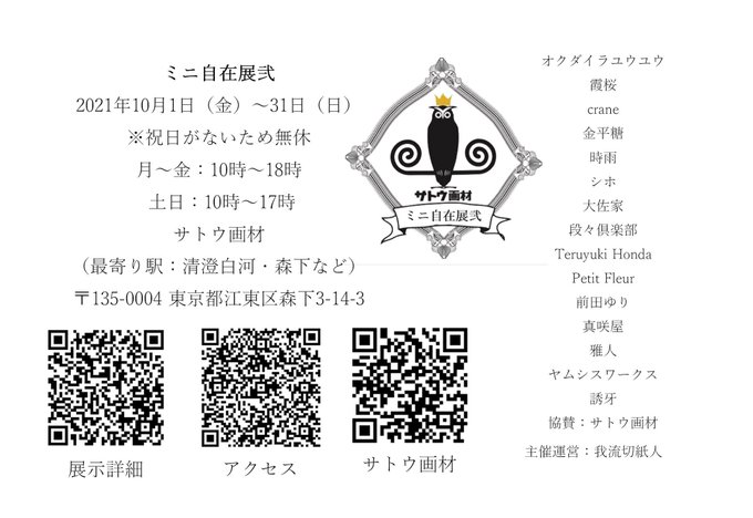 10/1(金)〜31(日)まで、#サトウ画材さん で開催される #ミニ自在展弐 に出展させていただきます。 月〜金 10:00〜18:00 土日 10:00〜17:00 ちょっと不穏なハロウィンテイスト強めの作品を中心に展示予定です。 よろしくお願いいたします。 note.com/garyukgn0510/n…