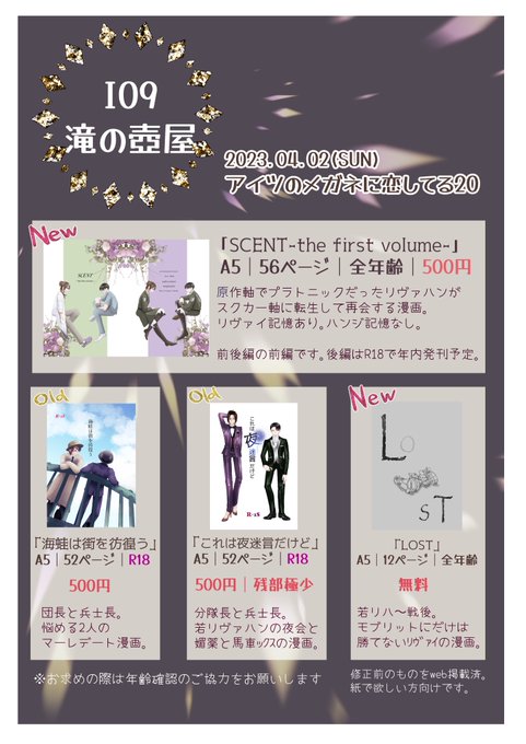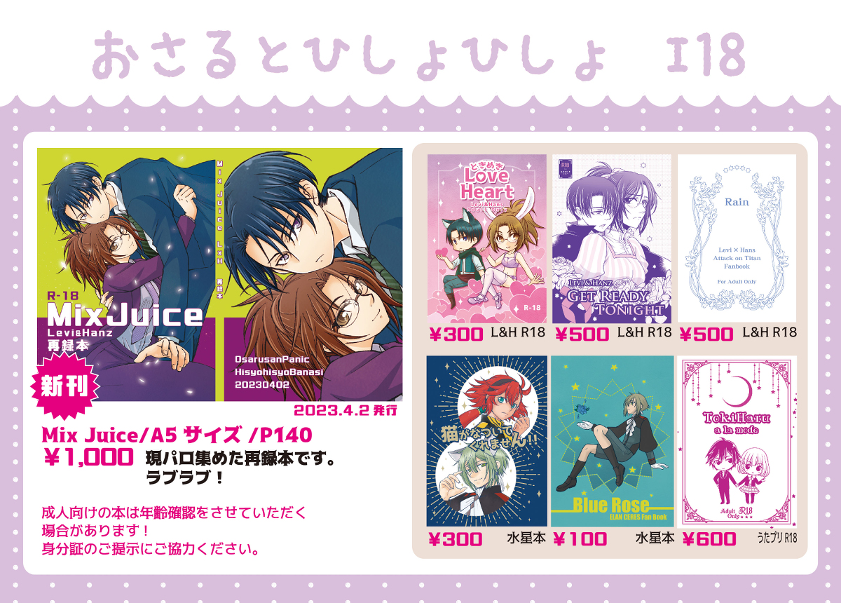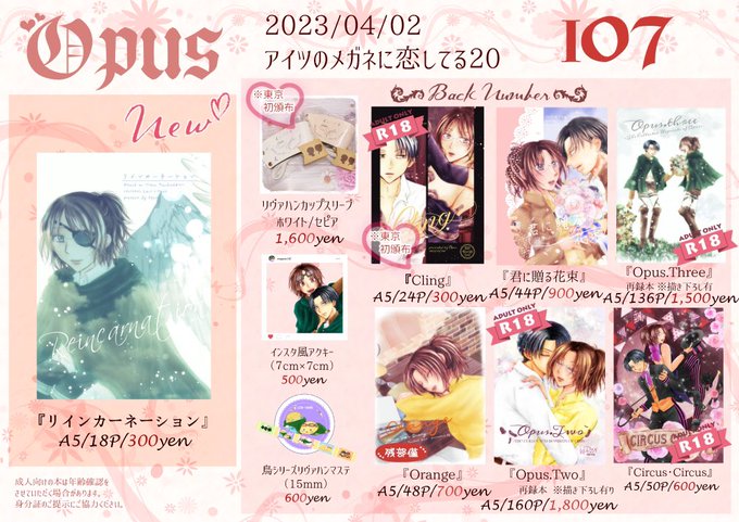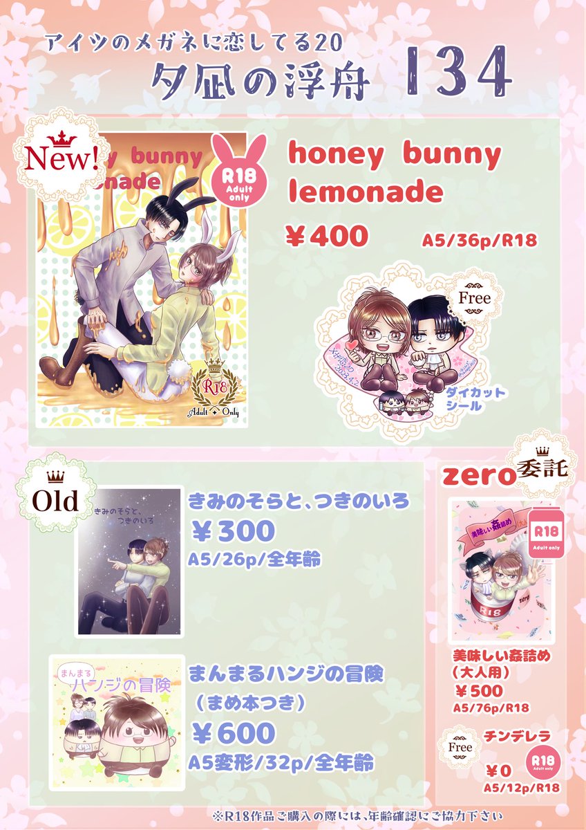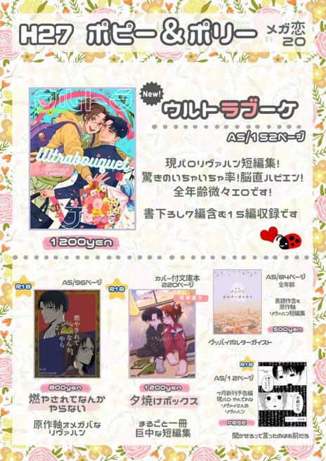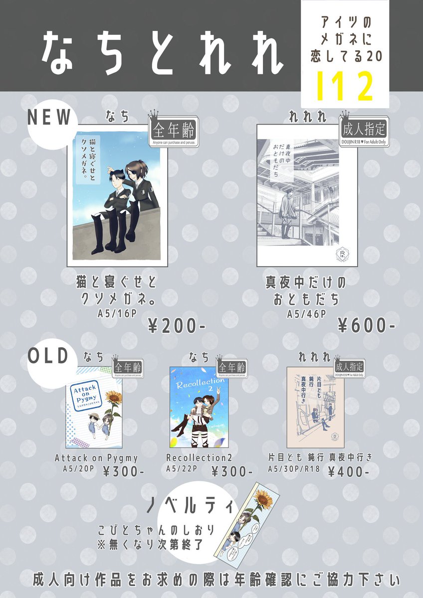 #メガ恋20 お品書きです。 無配ペーパー(ノビAースのリヴァハン漫画)たくさん刷ったのでもらって頂けると嬉しいです🥳 既刊のサンプルはそれぞれpixivでご覧頂けます。 pixiv.net/users/630191 よろしくお願いいたします!