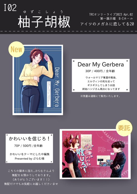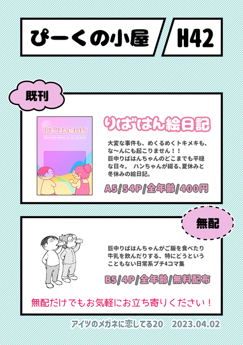 2023年4月2日東京流通センター(TRC)【アイツのメガネに恋してる20】に参加します! youyou.co.jp/only/_event/?i… 原作軸漫画「新緑と薄荷のルミネッセンス」の続きの新刊を出せるように頑張りたい……。 豆粉屋の豆粉さんのお隣で申し込んでいます。 #メガ恋20