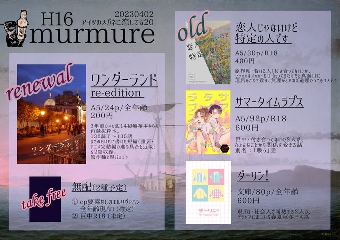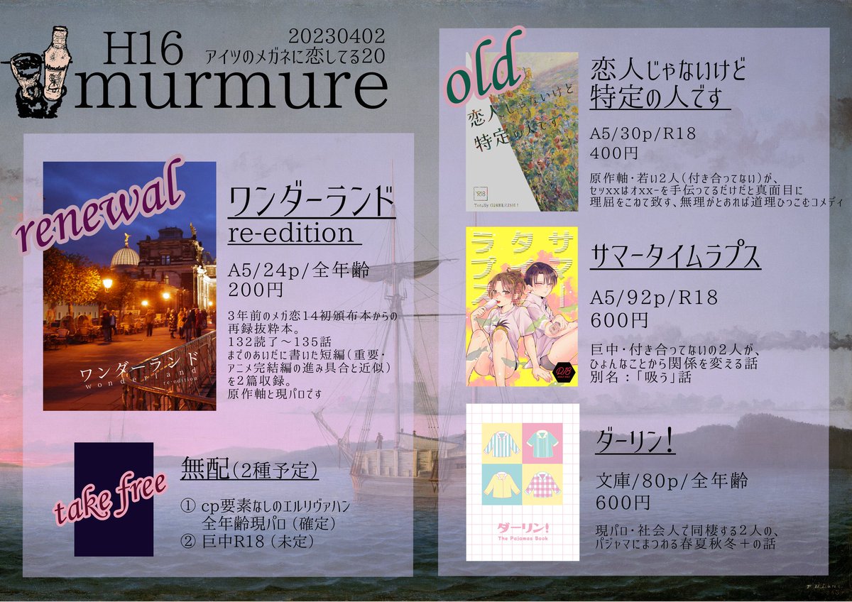 #メガ恋20 お品書きです🕺🕺 イベント初出しは突発抜粋再録本と無配です!がキャプション確認ください。当日はよろしくお願いします🥳 4/2メガ恋20 お品書き【H16/murmure】 | おと #pixiv pixiv.net/artworks/10671…