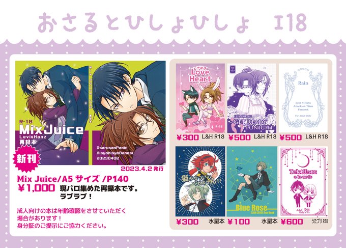 #メガ恋20 お品書きです! pixiv.net/artworks/10669… 新刊、既刊、こびとちゃんしおり持っていきます! 新刊はイベント後に通販予定です。 私の頒布物はサークル参加の方+お手伝いの方につきましてお取り置きいたしますのでリプかDM頂けましたら幸いです。 新刊の詳細はツリーにつなげます