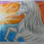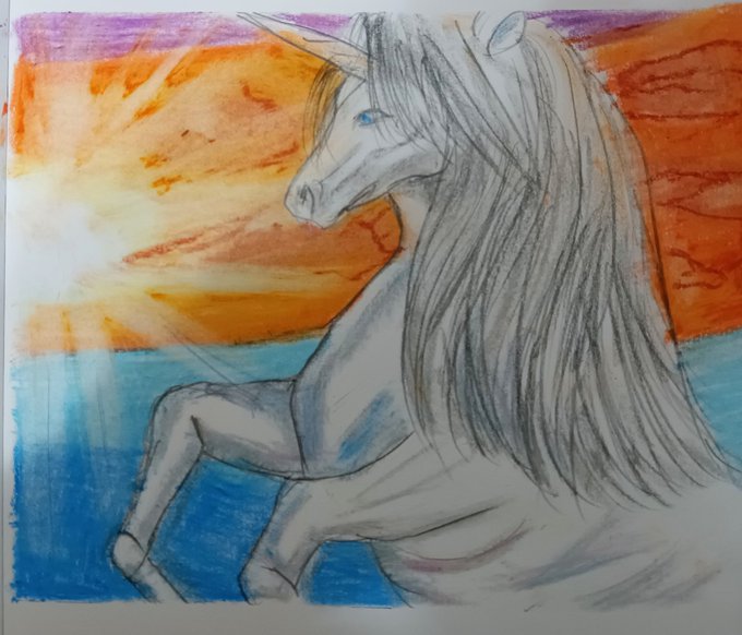 創作パステル画 「アルマ・ハーグ・レテ(選ばれた子)」 タイトルは造語です。 ユニコーンと夕焼け。 #オイルパステル #色鉛筆 #ユニコーン #生物天体MAHORO #絵描きさんと繋がりたい #みんなで楽しむTwitter展覧会