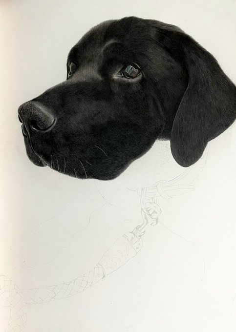 12匹ちゃん8匹目に進んでいます。 お顔が一番大きい上に短毛なので、陰影拾いに没頭中。 にしても、この幸せそうで優しい眼差しはなんなんだっ🥹描いててグッとくるよ。#ラブラドールレトリバー #色鉛筆画