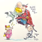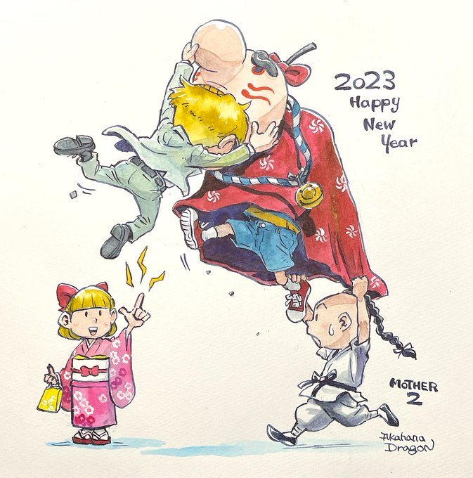 明けましておめでとうございます! 今年もよろしくお願いします! ※海外ゲーマーへの解説 "獅子舞"に噛んでもらうと幸運に...という謎の儀式です😆 #MOTHER2 #EarthBound #万年筆イラスト