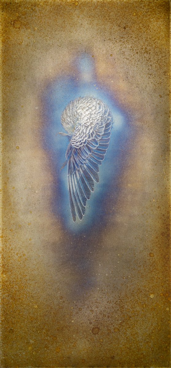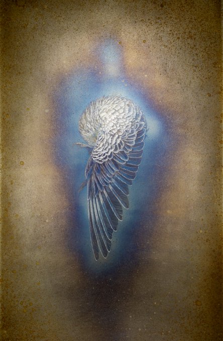 #世界で唯一無二の自分だけの作品をさらせ 着彩を一切せず、鉄に発生する錆を用いて描いた作品。 童話の青い鳥がモデルです。 愛情を持って己と向き合い受け止めた先で、ずっと探していた“青い鳥”を見つけられる、というメッセージを込めました。