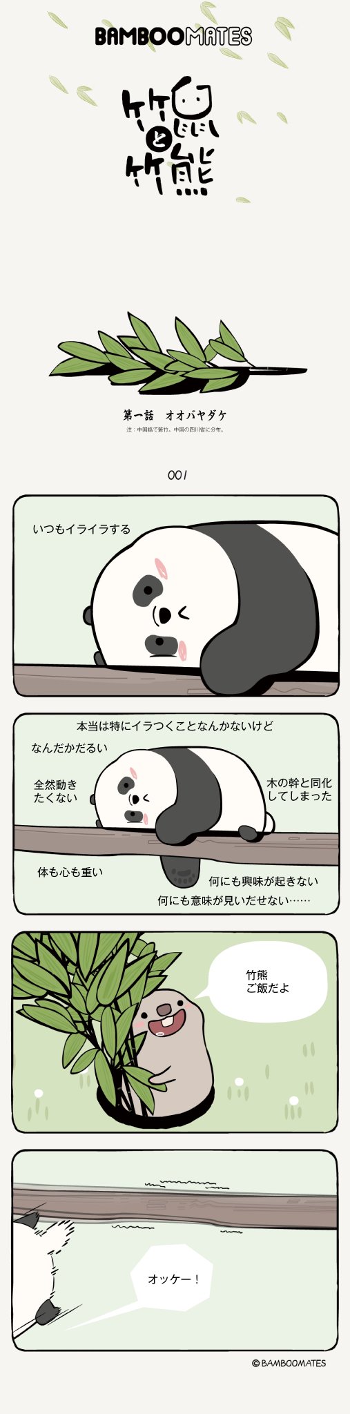 【新連載】『竹鼠と竹熊』 竹林で暮らす天真爛漫な竹鼠(タケネズミ)と悩める竹熊(パンダの別名)の日常を描いた漫画です。 第一話のタイトル「オオバヤダケ」はパンダの好物の一つ。 色々な動植物たちが出てきますので、これからお楽しみに! #漫画が読めるハッシュタグ #中国漫画