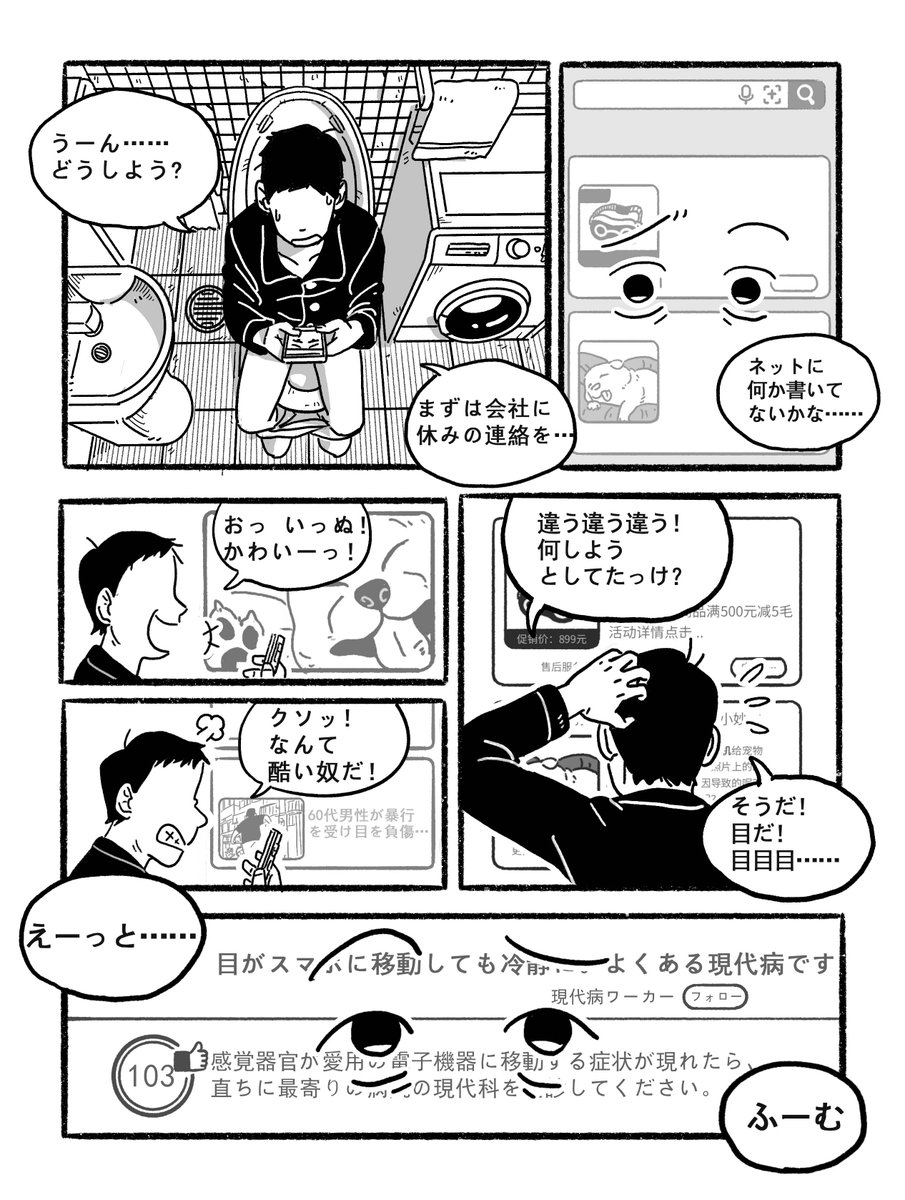 今回は中国の少し不思議なショート漫画をお届けします。 『俺の目がなくなった』1/2 作:楽楽 スマホの使いすぎで自分の目が顔からスマホに移動してしまうという現代病は、他人事ではないですね。 #漫画が読めるハッシュタグ #中国漫画