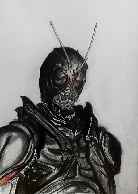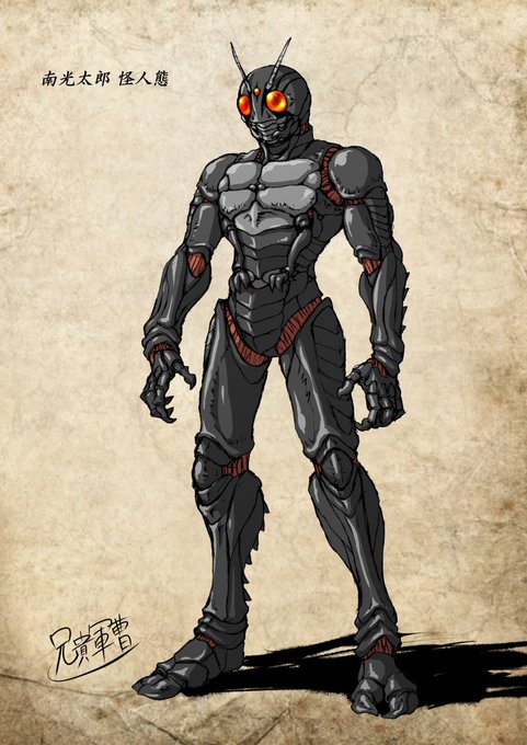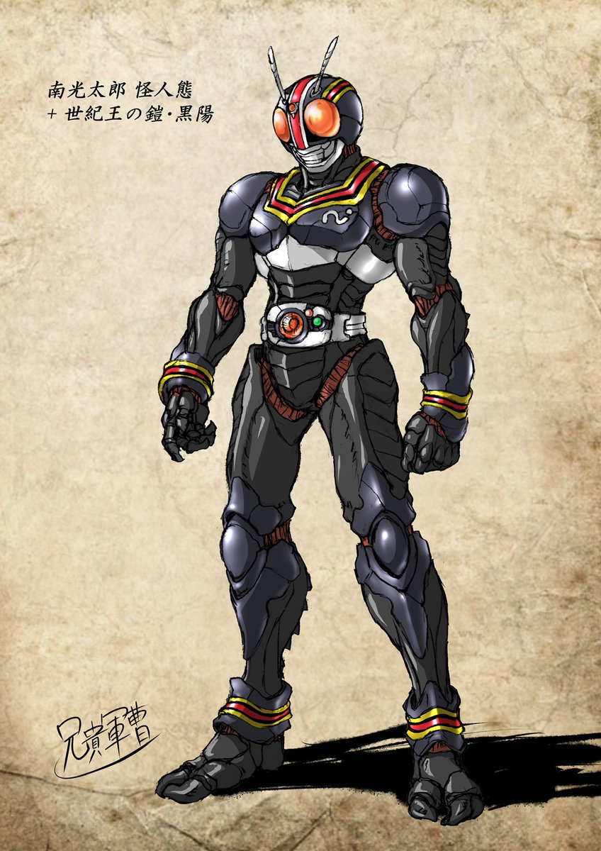BLACK SUN版ではなく、元祖仮面ライダーBLACKとして描きました。バッタ人間がキングストーンとベルトの力で生成した「世紀王の鎧」(薄く青みがかったパーツと銀色のパーツと3本線のパーツ)を纏っているというイメージ。 #仮面ライダーBLACK