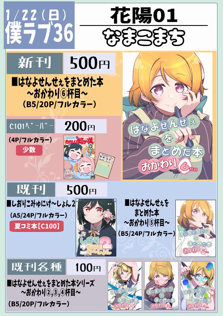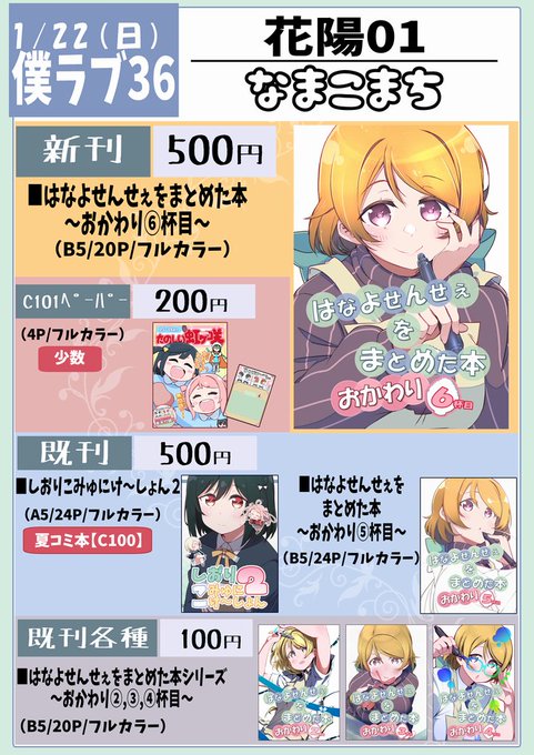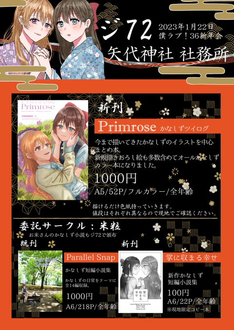 #僕ラブ36 【ジ72 矢代神社 社務所】 お品書き!!! ⛩新刊はかなしずのツイログ集。出来るだけ色紙描いていきます。 🍚委託で、お米さん(@ rice_tubu_rice )のかなしず小説も置きます。推薦図書です!!既刊と新刊で折本! よろしくお願いします! twitter.com/inori_meer/sta…
