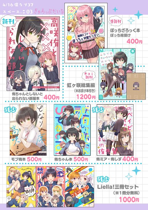 【僕ラブ37お品書き】 新刊は侑ちゃんと〇〇しないと出られない部屋本です。先々週のイベントの新刊ぼっちちゃん本も持って行きます 【スペース.ニ03 ぎゃろっぷだいな】 #僕ラブ37 【新刊委託】melonbooks.co.jp/detail/detail.…