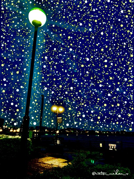ふと想うこと 夏の訪れ 緑も雨も蒸し暑さも夏の訪れを告げる 風情ある夏の前に流れる景色 タイトル:雨と夜 光と青の訪れ #みんなで楽しむTwitter展覧会 #イラスト好きな人と繋がりたい #写真好きな人と繋がりたい