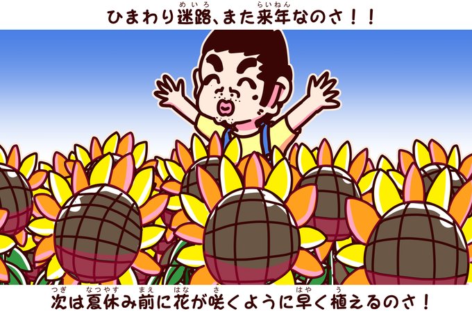 🌻たっくんのひまわり迷走日記🌻 ひまわり迷路、また来年なのさ‼️ 次は夏休み前に花が咲くように早く植えるのさ😊 #イラスト #写真好きな人と繫がりたい #イラスト好きな人と繋がりたい #絵描きさんと繋がりたい #落書き #ひまわり迷路 #子どものころの夢を大人になってから実現