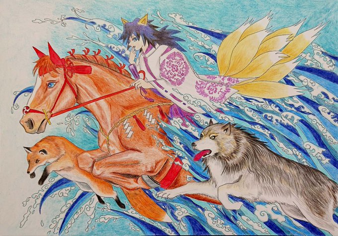 リクエスト✨ 「狼と狐を従え厄除へ向かう九尾ぎゆゆ🌊さん」 #冨岡義勇 #アナログ絵 #色鉛筆画 #鬼滅の刃ファンアート ※このイラストの九尾狐は、天狐となり天界から遣わされた瑞獣伝説を基に描いています🐺 狐は模写です😊 初めてリクエスト❤️を頂いたので妄想で描きました(///∇///)💙 twitter.com/b7_ynr/statu…