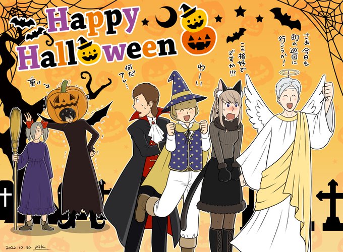 ハロウィンイラスト描きました! コンクエの皆さんに仮装してもらいました🎃 マグラさんは拒否ったので作者からペナルティ食らってます笑 #ハロウィンイラスト #創作漫画コンクエ #絵描きさんと繋がりたい