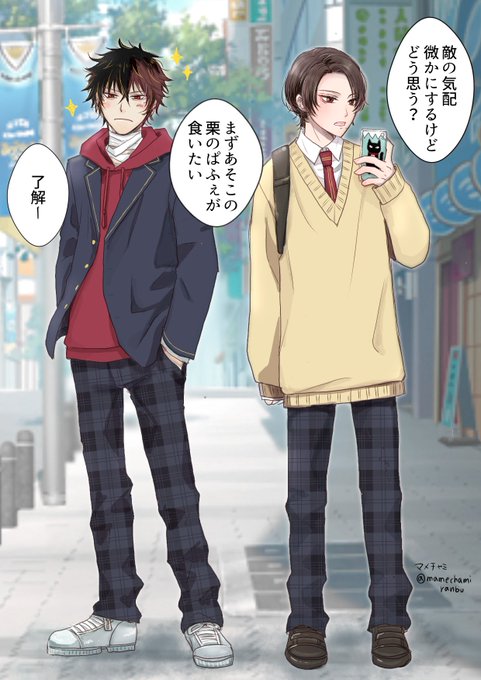 令和遠征赤×黒ペア 男子高校生ver. 何回か組んだ後は気負わずマイペースに過ごせるし、お互いのクセも軽くあしらえる(あしらって貰える)ので、仲良しというよりも「コイツとは楽だな」ってコンビ。あと二人共買い食いするタイプだからそれも楽しみ😘 #肥前忠広 #加州清光 twitter.com/mamechamiranbu…