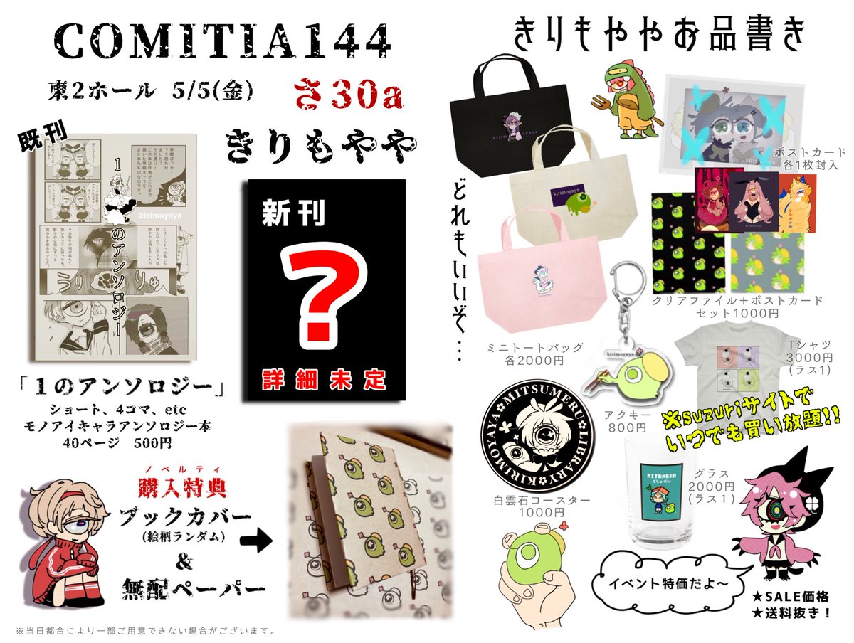 #COMITIA144お品書き #単眼 #コミティア144 ※当日出展は体調次第 サークル【きりもやや】スペースは 「さ30a」です(⊙)✿ 新刊出たらいいな〜!🏁 出たら午後から離席するかも🫡 twitter.com/kirimoyaya/sta…