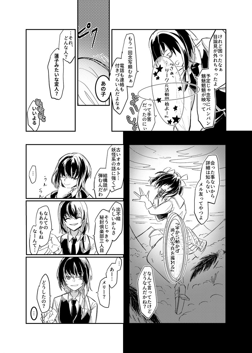 第二十回博麗神社例大祭、新刊を先行で全文公開します。気に入ったら物理本買ってね。本文42P、500円です。 連メリ「この関係性の名前は」(1/11) #第二十回博麗神社例大祭 #博麗神社例大祭 #連メリ