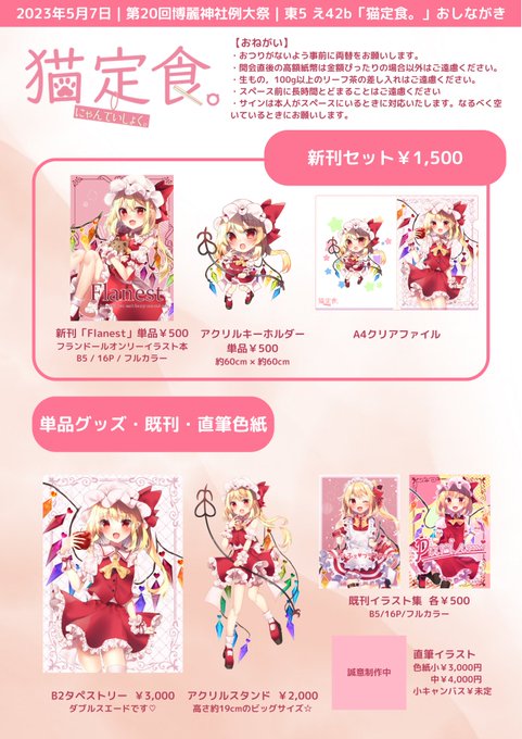 【例大祭お品書き】 5/7(日)東京ビッグサイトにて開催の「博麗神社例大祭」のおしながきです 今回は新刊セット頒布します✨アクスタもタペもあるよ🥰 【え-42b/猫定食。】にてお待ちしております💕 #東方Project #博麗神社例大祭