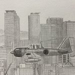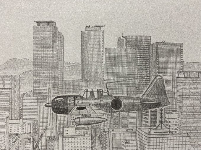 #名刺代わりの作品をあげてください 零戦と名古屋の空です。 この作品は私が時折描く空想風景画のうちの一つなのですが、普段は使わない定規を多用するなどして頑張った思い出があります…! この作品を発表してから、海外の方を中心にフォロワーさんが10日で約300人ほど増えたのが印象的でした…!