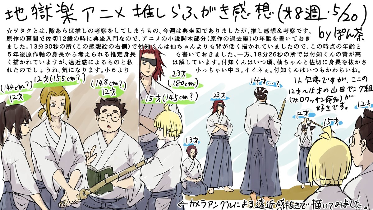 #地獄楽アニメ 第8話から今日まで2週間もあったのに、大阪地獄楽カフェ遠征と過労働と低気圧による寝落ちで、うpできず滑り込み投稿です。 図らずもこの回放送直前のFAに山田ヤング組を描いていたのですが、この6人(1人欠席)の仲よし学齢期がアニメで見れて本当に嬉しい🥲 #地獄楽ファンアート twitter.com/poncha12345/st…