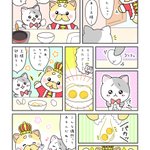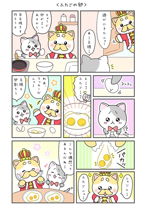 卵を割ったらご当選〜♪ 今日の晩御飯は、目玉焼き🍳 卵をこんこん・・・なんと!ふたごの卵だったニャ! 双子の卵の確率は、1%ニャ! 1%を2回出すということは・・・! 王様達はとってもすごいことをしたニャー ふたごの卵って得した気分で嬉しくなるよね😸 #漫画が読めるハッシュタグ #夜ご飯