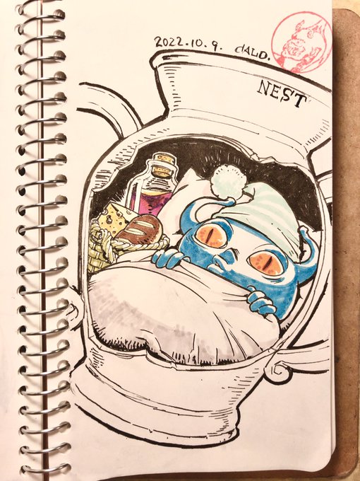 #インクトーバー2022 #inktober2022 #インクトーバー #inktober #メガテン #女神転生 10月9日NEST/寝ぐら アガシオンです。 用がない時はあの壺の中で寝てたらかわいいなと思いました。夜食&ドリンクもしっかり持ち込んでます。おなか空いて寝られないなんて事があったら大変ですもんね。