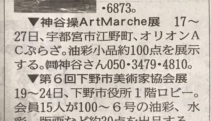 神谷操Art Marche展 二日目突入です 昨日(12.17)の下野新聞に 情報が掲載されました。 宜しくお願いします! #展覧会 #油絵 #oilpainting #栃木 #宇都宮 #下野新聞 #illustration #art #個展 #絵描きさんと繋がりたい #日本 #Japan #オリオン通り