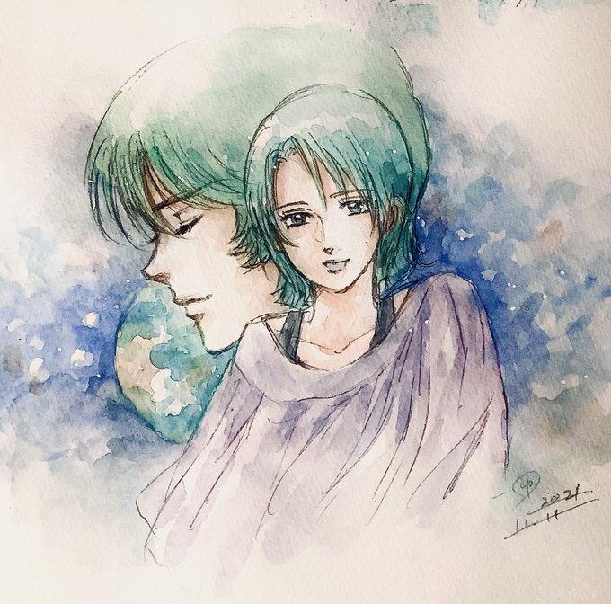 #カミーユ・ビダン生誕祭 #カミーユ・ビダン生誕祭2021 #Zガンダム #富野由悠季 今日はカミーユの誕生日なので。今年はフォウと一緒に #水の星へ愛をこめて のイメージで描いてみました。 それから、富野監督の文化功労者顕彰も本当におめでとうございます✨