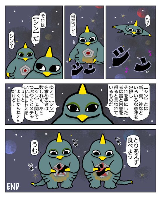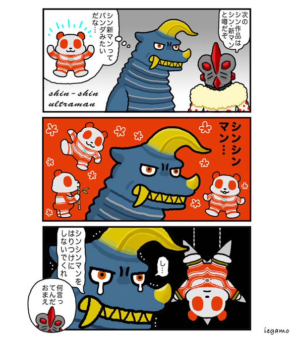 #ベムスター50周年 【ベムスター、シンとの遭遇】マンガ。 #帰ってきたウルトラマン #ベムスター #ファンアート 新シンウルトラマンにベムスターが登場したら、ウエストがくびれちゃうんじゃないか、足が長くなっちゃうんじゃないか、◯◯…私の好きな食べ物ですとか言うんじゃないかと今から心配です