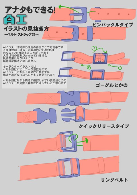 【AIイラストの見抜き方】 ベルトやストラップ類のような外から構造が判別できる意匠はAIキャライラストの苦手とする分野です 「どうやって見分ければ良いの?」 という方は衣装、装飾品の構造に注目してください イラストは手描きと偽る作品を判別する参考までに #絵描きさんと繋がりたい #手描き
