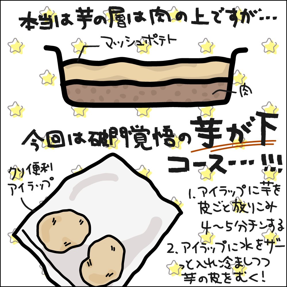 大好きな "シェパーズパイ" の… "ようなもの" を作った日記!!洗い物を減らしたいために肉と芋の層が逆転しましたが、結果オーライ。 芋はやっぱりアイラップにぶっこみ&レンチン&流水で冷ましながら剥くのが一番ラクですね〜〜。 続きはブログで。 babaikuji.com/archives/30793… #ババアの漫画 #料理