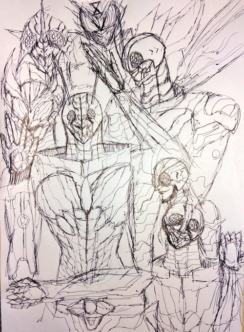 新宿駅の地下通路、上野の高架下、誰もいないトンネル、朝焼けの御徒町、あなたが空想すればそれは実在するし、みんなの心の中にいます。 今のどこかで戦っています #仮面ライダー #平成ライダー #昭和ライダー #漫画家志望さんと繋がりたい #仮面ライダー好きと繋がりたい #アナログ絵