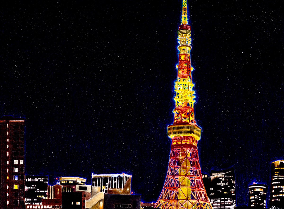 6月4日「キラキラした東京」 夜の東京タワーは願い事を叶えてくれそうなくらいにキラキラしてる…🗼✨ #ちゅっちゃんの毎日 #tokyo #東京タワー #イラスト #illustration #絵 #1日1絵